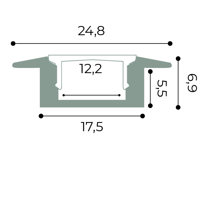 Led profiel inbouw RSL7 in geanodiseerd aluminium AL6063 met zwarte poedercoating RAL9004. Complete kit met ledprofiel 2m en opaal cover in PC, 2 eindkappen zonder kabelingang en 2 eindkappen met kabelingang in een handige en stevige kartonnen koker.